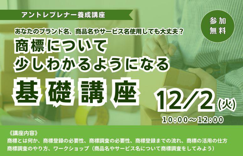 商標とは何か、商標登録の必要性、商標調査の必要性、商標登録までの流れ、商標の活用の仕方、商標調査のやり方、ワークショップ(商品名やサービス名について商標調査をしてみよう)